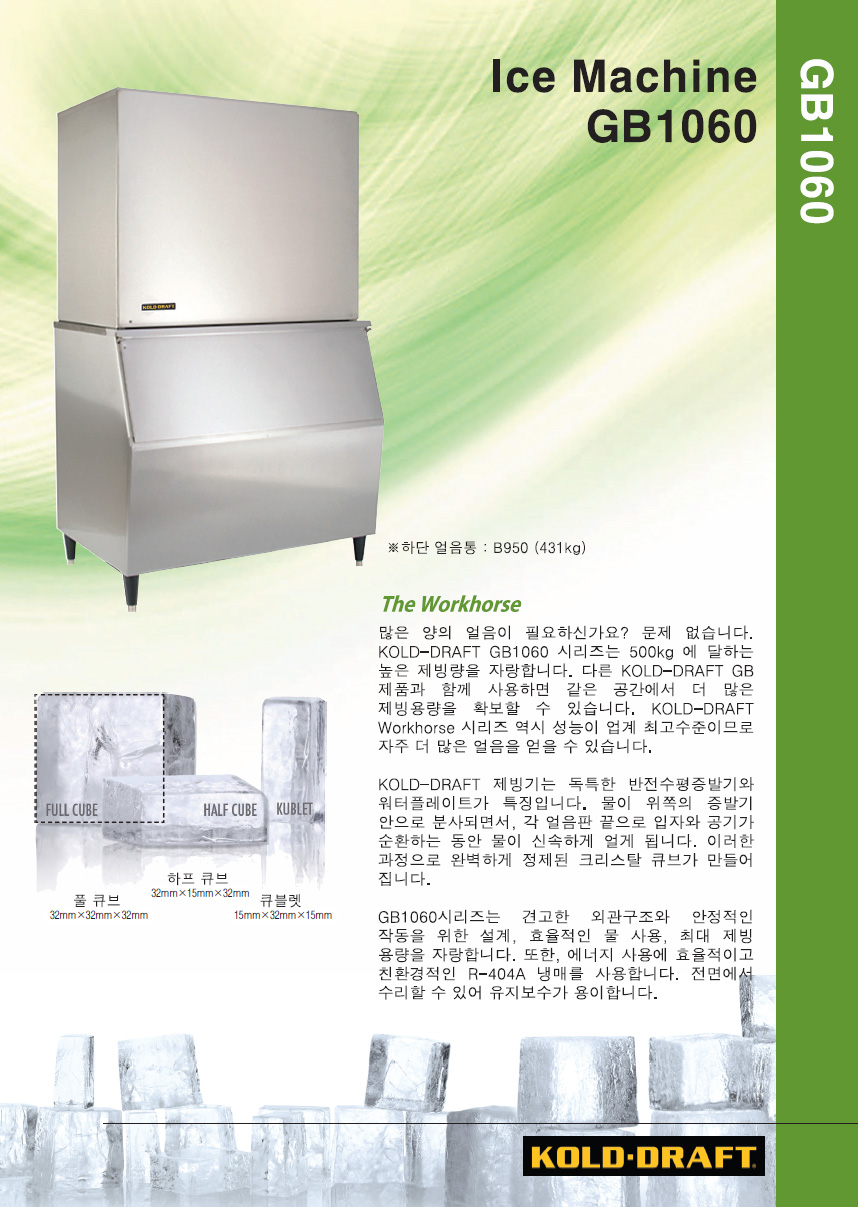문제 없습니다. KOLD-DRAFT GB1060 시리즈는 500kg에 달하는 높은 제빙량을 자랑합니다.