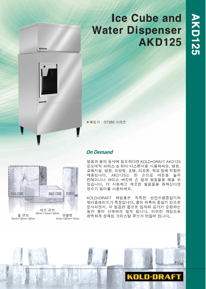 얼음과 물이 동시에 필요하다면 KOLD-DRAFT AKD125 오토매틱 아이스 & 워터 디스펜서를 사용하세요.