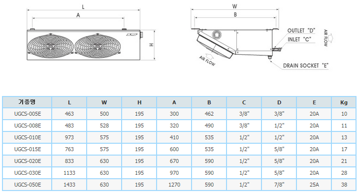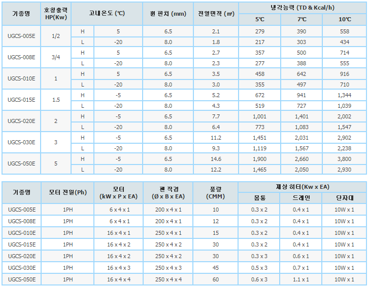 적용HP:1/2HP ~ 5HP 고내온도:고온/저온 5℃ ~ -20℃ 휜피치:6.5mm / 8mm