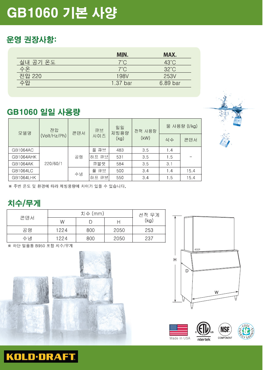 GB1060시리즈는 견고한 외관구조와 안정적인 작동을 위한 설계, 효율적인 물 사용, 최대 제빙용량을 자랑합니다.