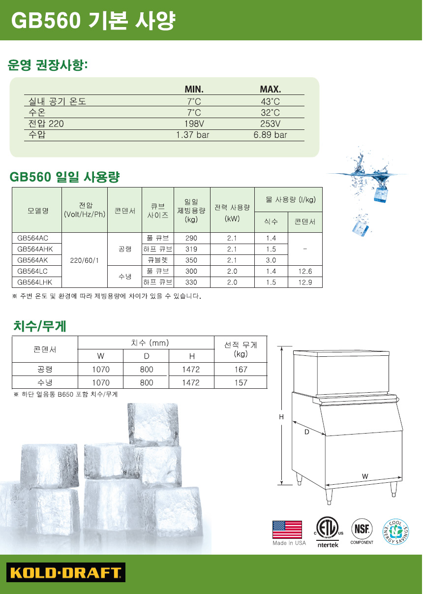 대용량 제빙과 다양한 옵션의 KOLD-DRAFT GB560 Signature 시리지는 가장 인기있는 모델입니다.