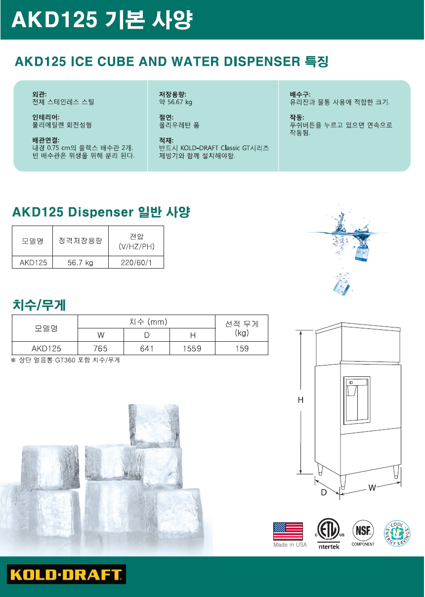 얼음과 물이 동시에 필요하다면 KOLD-DRAFT AKD125 오토매틱 아이스 & 워터 디스펜서를 사용하세요.